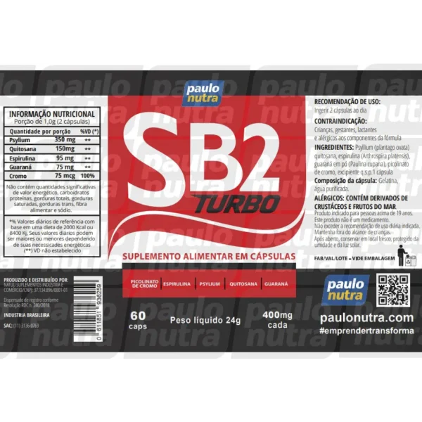 O SB2 Turbo é um suplemento natural desenvolvido para ajudar no processo de emagrecimento de forma saudável. Com ingredientes como Psyllium, Quitosana, Espirulina, Guaraná e Picolinato de Cromo, este suplemento auxilia na digestão, redução de absorção de gordura, controle do apetite e regulação do metabolismo. Basta tomar duas cápsulas por dia com água, preferencialmente junto às refeições principais. Adicione o SB2 Turbo à sua rotina para obter um impulso extra em seus esforços para alcançar um peso saudável.